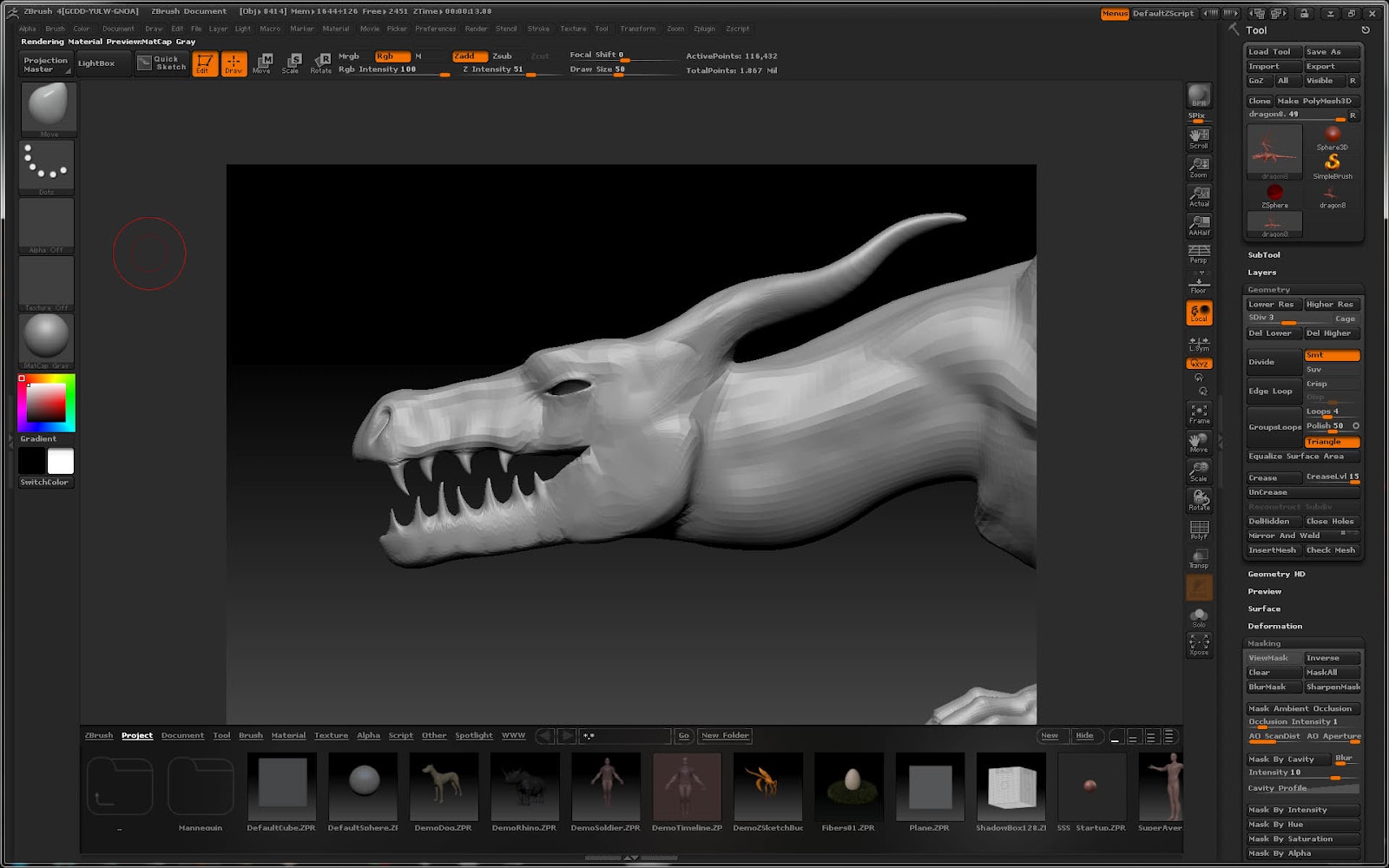 Started on the dragon's head today. I have a bit of messy topology on the head from the zspheres, causing pinching in some spots, but the relax tool makes things go a little crazy, so I'm going to have to look for other ways to fix it.